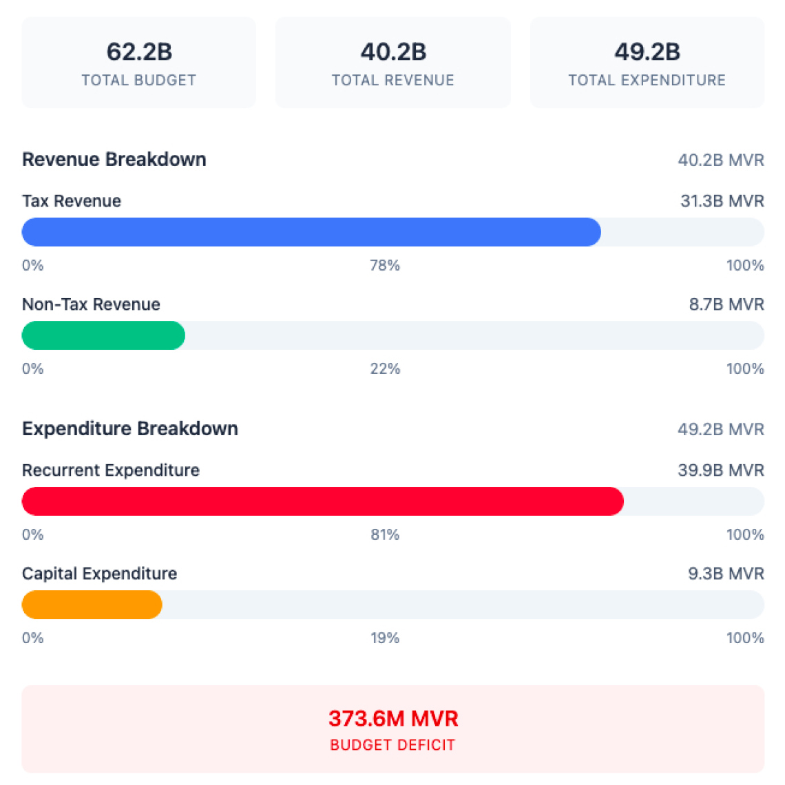 އަންނަ އަހަރުގެ ބަޖެޓު ޑެފިސިޓް ފައިނޭންސް ކުރުމަށް 8.8 ބިލިއަން ރުފިޔާ ބޭނުންވެ އެވެ. ޑެފިސިޓްގެ އިތުރުން ބަޖެޓަށް ދަރަންޏަށް ބޭނުންވާ ފައިސާ ހޯދުމަށް 26.3 ބިލިއަން ރުފިޔާ ހޯދަން ޖެހޭނެ ކަމަށް ބަޖެޓުގައި ކަނޑައަޅާފައިވެ އެވެ. އަންނަ އަހަރުގެ އިގްތިސާދު ކުރިއަރާނެ ކަމަށް އަންދާޒާކޮށްފައިވަނީ 5.3 ޕަސެންޓުގަ އެވެ.