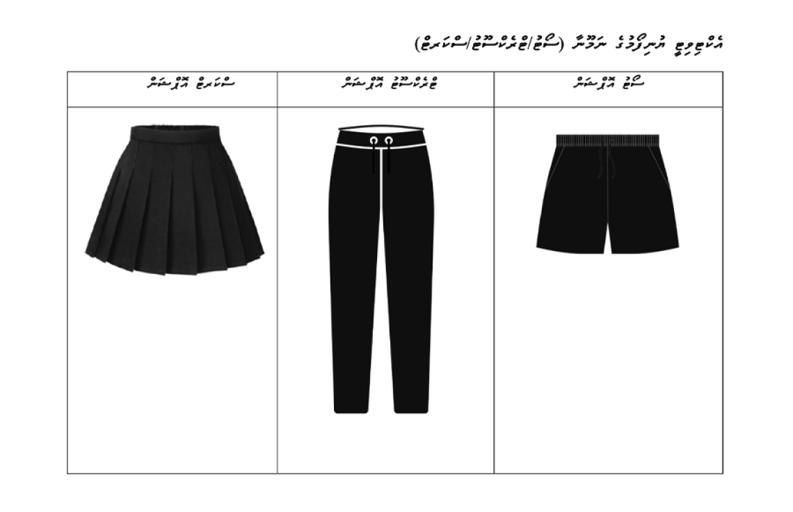 ފެހި، ރަތް، ނޫ ނުވަތަ ސްކޫލުން ބޭނުންކުރާ ކުލައަކުން އެކްޓިވިޓީ ޔުނިފޯމު ލެވިދާނެ އެވެ. އެކްޓިވިޓީއާ އެކު ސްކާޓް ނުވަތަ ފަޓުލޫނު ހުންނަން ޖެހެނީ ކަޅު ކުލައިންނެވެ.